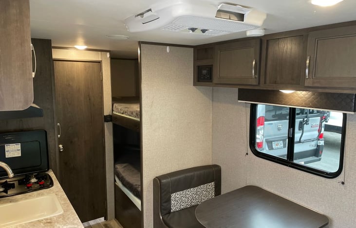 New 21' camper with a queen size bed, convertible table, and 2 bunks. Can sleep 5 comfortably. Outdoor awning, with LED Lights, bluetooth connection, and TV/cable connection.