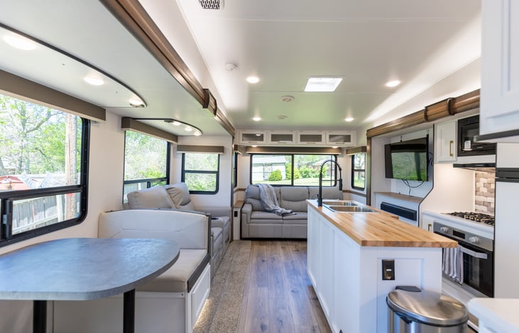 The 7-person Crusader has a spacious living area that feels just like home with a kitchen island, recliner chairs, and a wide 3-seater couch.