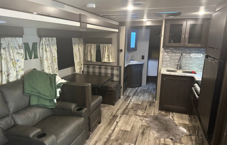 2022 Transcend 321BH with 2 bunks and a private queen bedroom. Dinette can be converted into a full sized bed as well. Will be hooked up and ready for you to step in once you arrive at your destination of choice.