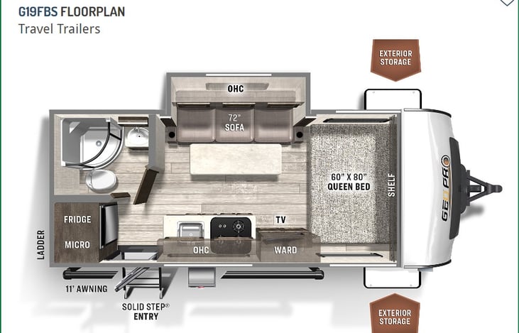 The Rockwood Geo Pro 19FBS is a rear entry couples coach with a small slide that offers so much great space. The large bathroom is one of the best features of this small couples coach. The 72” pull-out sofa also makes for a great bed for guests, children or pets. At 20’ and light weight, you will not be able to get more walk around footage than this great couples coach.