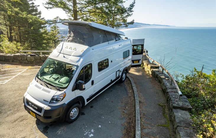 A 2022 Winnebago Solis van that is small enough to drive, but big enough to be comfortable.