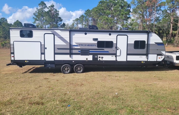 Spacious with modern upgrades. Great for traveling with kids! Has a bunk area in the rear with 4 beds & a Roku TV & Playstation 4. Pet friendly camper your family and friends will definetly enjoy!