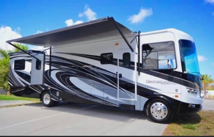 This is our home on wheels, George. George is a 37' Class A RV. He has all the amenities of home, I.E. dishwasher, Residential refrigerator, washer/dryer combo 1.5 baths with a shower you can actually take a shower in. Outside is an outdoor TV and radio with awning and awning light. This RV has all comforts of home and is a great way to travel. Has new steering stabilizing bar and new suspension.