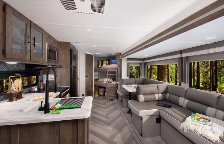 The 26DBUD is the perfect family travel trailer, with double bunks at one end and a queen bedroom at the other. It includes an electric fireplace for ambiance, full kitchen with glass-fronted cabinetry and large pantry, a U-dinette, and the customizable Versa-Lounge with lots of storage.