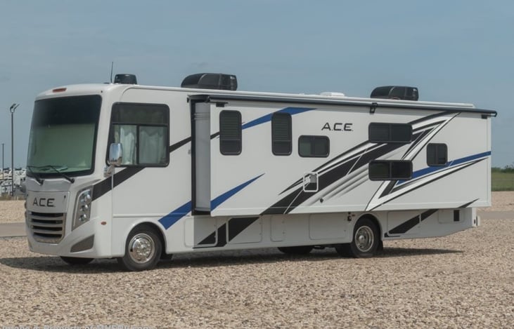 Thor Motor Coach A.C.E. Model 32.3 Bunk Model is approximately 33 feet 5 inches in length featuring a full-wall slide, modern decor updates, Ford V-10 engine, hydraulic leveling jacks, LED running & marker lights and the beautiful HD-Max exterior. Dual 13.5K BTU A/Cs with 5.