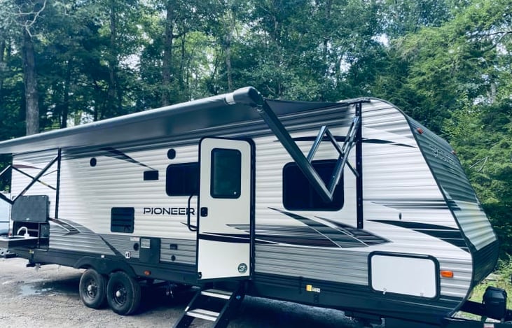 Enjoy a perfect getaway with this cozy 2021 Pioneer Bunkhouse. Has indoor and outdoor led lighting, outdoor kitchen, outdoor shower, outdoor speakers, bunk beds, residential size full bed, the sofa and dinette table folds into extra sleeping room. Big awning out front to relax under.