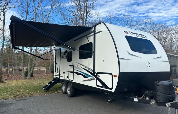 Description This 2020 Forest River boasts 1 slide out , electric awning, power jack and stabilization, with lots of storage for your personal belongings. Utilize the outdoor refrigerator for your outdoor cookouts. Surveyor comes completely stocked with cups & silverware, pots & pans, dish towels, paper supplies for your outdoor cookouts, a camping table.
