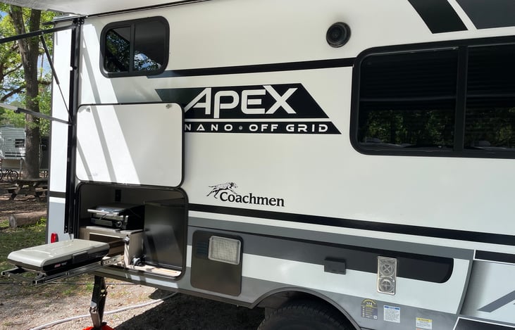 New 2022 Apex Nano. Perfect for a family of five. Accommodations in queen size bed, two bunk beds and dinning table that turns into a bed. Spacious bathroom and kitchen area.