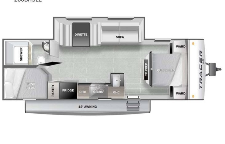 Take the whole squad along (6) in the Tracer 260BHSLE. This model weighs in at just over 5,000 lbs. without sacrificing space (1/2 towable). The front queen bedroom is separated from the rest of the coach by a partial wall and solid doors for added privacy, while the rear bunk room provides a pair of roomy double-over-double bunks.