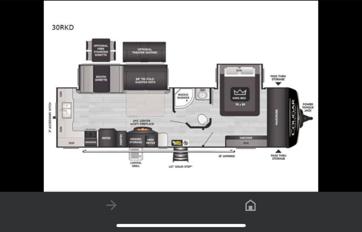 This is our brand new Cougar has a very open floor plan Large kitchen area, 50” tv in the living room with heated recliners, bedroom has a great double closet mounted smart Tv and a king size bed
