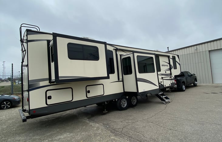 This fifth wheel is so spacious and nice! Just entered into our fleet, this unit has 5 slide outs! Sleeping 6 people, there is a king bed in the master, then two tri-fold sofas that can sleep 2 people on each. When the slides are open, there is even plenty of room where you could even put a queen inflatable mattress to sleep even more people.