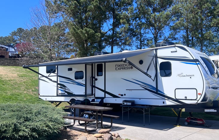 Our 2022 coachman freedom liberty has a fully equipped kitchen with all the necessary items. With 36 ft of living space and very thought after design there is plenty of space for the whole family. Our standard package will come with an outdoor rug, 2 folding chairs, gas griddle, outdoor table, 2 full propane tanks. Taking you inside, fresh clean linens are provided for every sleeping area.