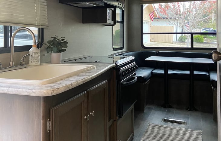 Hi! This RV is easy to set up and is very well cared for and clean. It features a queen bed and a dinette that turns into another bed for 2. Enjoy your meals with a beautiful view while seated at a spacious table with an extra large window. Trailer comes ready to go with cooking supplies, clean bedding, clean towels, 2 camping chairs, a corn hole game and of course a coffee maker.