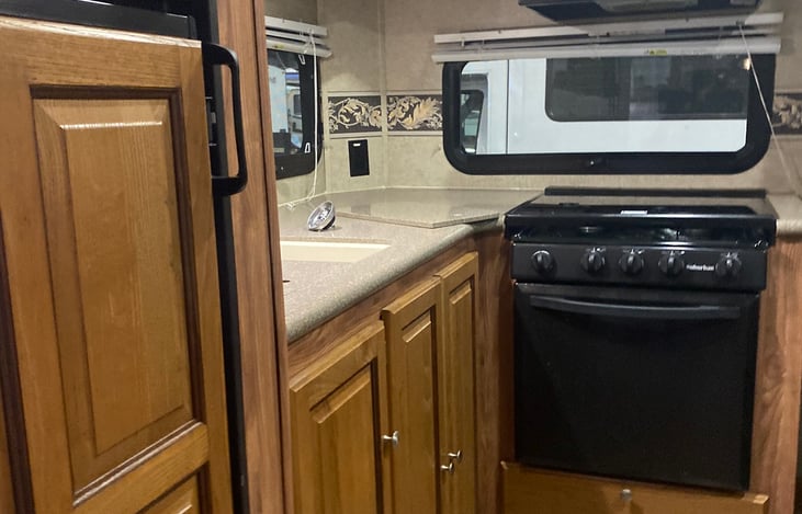 29’ tow behind. Beautiful and well taken care of, comfortable camper. Private bedroom with queen size bed. Tons of storage for clothes and necessities. Awesome entertainment package with indoor and outdoor speakers for music and movies nights. Full kitchen with propane range/oven, microwave, counter space and a double sink with a refrigerator and freezer!