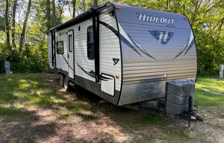 Getaway from the daily grind in our fully stocked travel trailer! We include so many extras—from linens and kitchen ware to camp chairs and a small grill.
