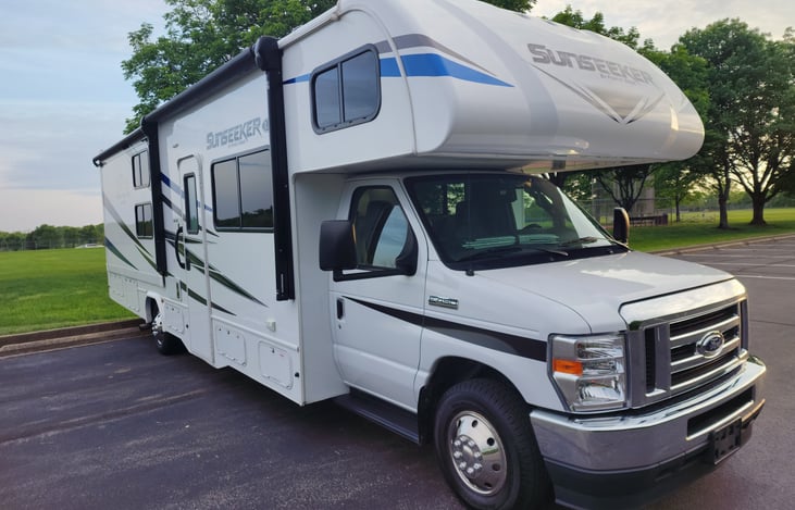 32ft 2021 Sunseeker! This Class C RV is easy to drive and perfect for a big family! It comes with 2 slide out . Experience the great outdoors with the comfort of a modern home. Can seat 8 people and sleeps up to 10. (6 adults/4 kids or 8 adults). Queen bed in the main bedroom , another queen bed over the cab , 1 single bunk , 2 twin size fold out sofa and a convertible dinette.