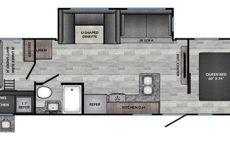 Perfect camper for a family. The back room has 3 bunk beds and a couch. The kids can have their own space because the back room has a door separating them from the kitchen/livingroom area. Front bedroom has a queen and also has a sliding door separating them from the main area. Kitchen table has plenty of sitting area for everyone to enjoy meals at on a rainy day.
