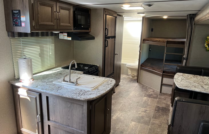This camper has served our little family well! Sleeps 8-10 with all modern amenities making it the perfect Home Away from Home. The power awning, LED outdoor rope lights, outdoor speakers combine vibes of relaxation with convenience.