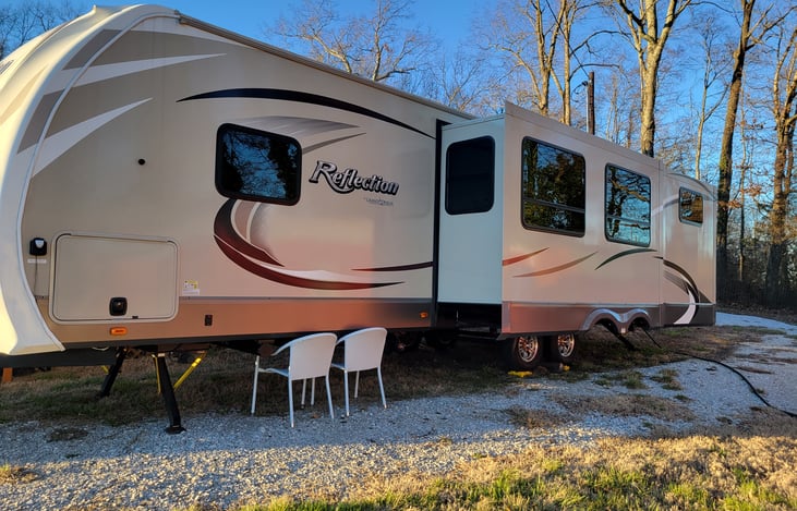 Nice comfortable, roomy RV. 2 ac's to keep you cool by day and fireplace to stay warm at night. Large outdoor kitchen with microwave, sink and refrigerator. K-cup ready coffee pot. Bunk house, sleeps 8. 2 TV's-- living room and bedroom.