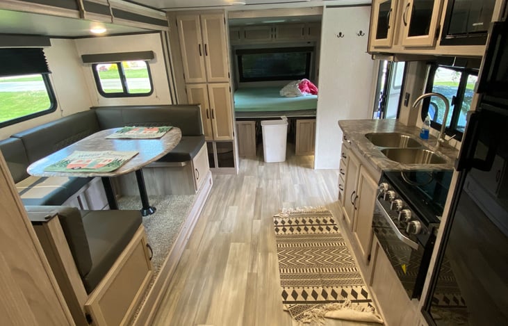 Inside you will walk in to plenty of space. A U shape table that will fit 6 adults around. It also turns in to a full size bed.