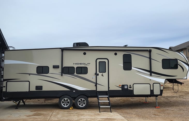 Gorgeous 5th wheel! This camper can sleep up to 9 with a queen bed in the front, two full bunks in the back, pull out couch, and dining table/bed conversion. 30 Amp hookup with solar panels on the roof and dual batteries. It has a small outdoor kitchen with an outdoor shower. It also has a power awning with awning lights to create a nice outdoor atmosphere!