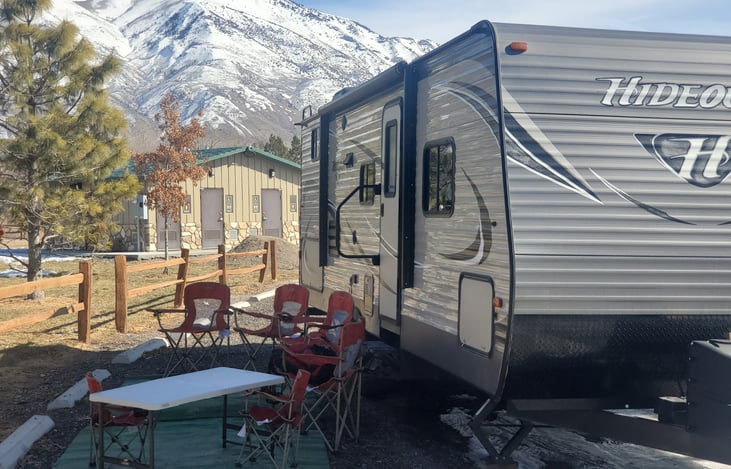 This Hideout is bumper towed with lots of amenities including: indoor and outdoor kitchens, a great entertainment system with indoor and outdoor speakers, indoor and outdoor showers, (The indoor bathroom is large enough to use as a dressing room.) The heater and AC are wonderful and controlled by thermostat.