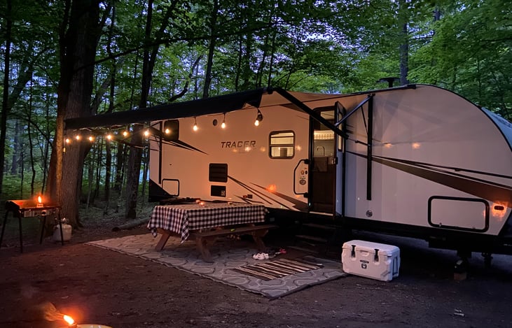 Our 2020 Tracer was given the name Trey Trey by our young children. From tailboard to tow hitch it measures 28' making it extremely easy to get into sites at RV Parks and New York State campgrounds. This camper is the perfect size for our family of 5. It offers plenty of interior space and with its large awning plenty of outdoor space. Pick up and drop off times are flexible.