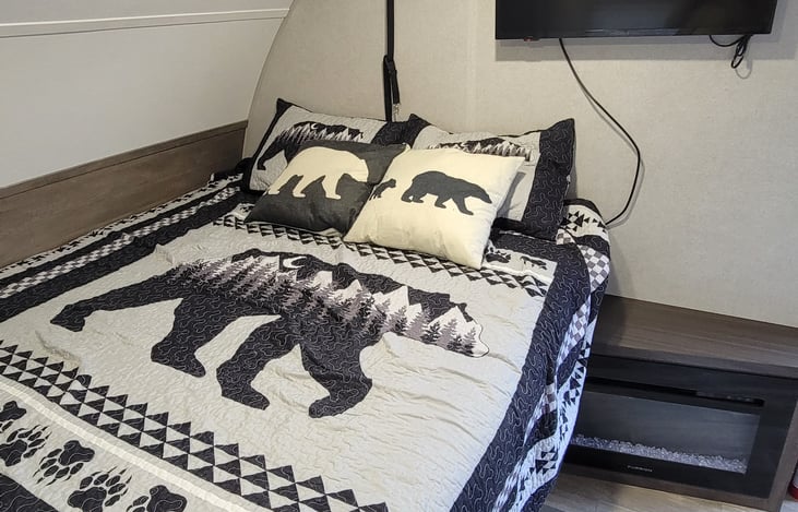 Awesome amenities include indoor outdoor speakers and TV. The toy hauler ramp turns into a back deck with fencing, mesh screen included with booking!