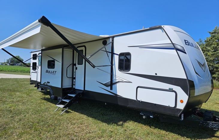 Hi, my name is Jill. I welcome you to experience camping in Luxury and Style with our newest addition to our fleet! Load up the family and start your next camping adventure of your dreams. 2022 Keystone Bullet Luxury 38’ Bunkhouse Travel Trailer that features double slides, private master bedroom, separate bunk room and Bathroom for the kids, and two entry doors from the outside.