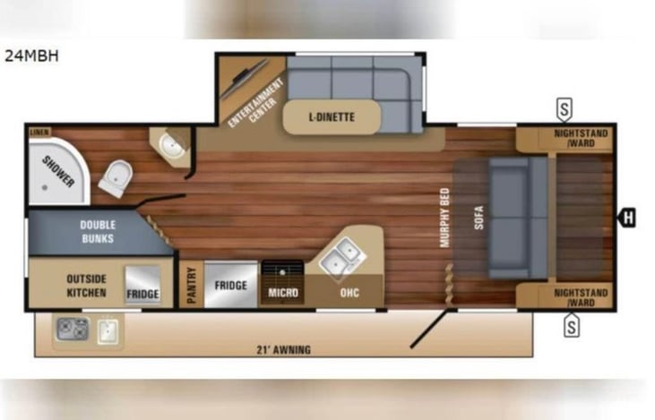 This is a great setup for families! Jayco White Hawk is the top of the line model. We keep this trailer very clean and sanitize after each use. It includes and outdoor kitchen, refrigerator, and shower!
