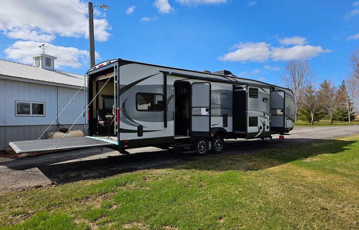Our spacious & cozy camper sleeps up to 7 & is fully equipped with sink, stove top, microwave, toilet, shower, TV, sound system, A/C, heat, reclining couch, 2 electric slide outs, retractable awning & pass-through dinette with a pull-down screen.