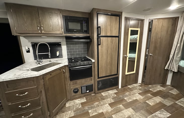 RV rental for up to 8 campers with a King size memory foam mattress with double bunks and a pull out sofa. Double entry doors with direct access to the bathroom. Kitchen is stocked with cookware, coffee maker, toaster and other essentials. I also have the sway bars to make pulling easier. Outdoor hot and cold water for if you really get dirty.