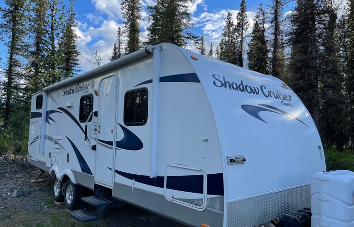 Here is our gorgeous 2012 shadow cruiser. The trailer has a huge slide which offer a plenty of room on those rainy days stuck inside. The camper comes with a queen bed up front. Power everything on this camper. With the camper comes fold up chairs. Also several yard games with no extra charge. No linens will be provided. The queen bed will also come with a cleaned bed protector.