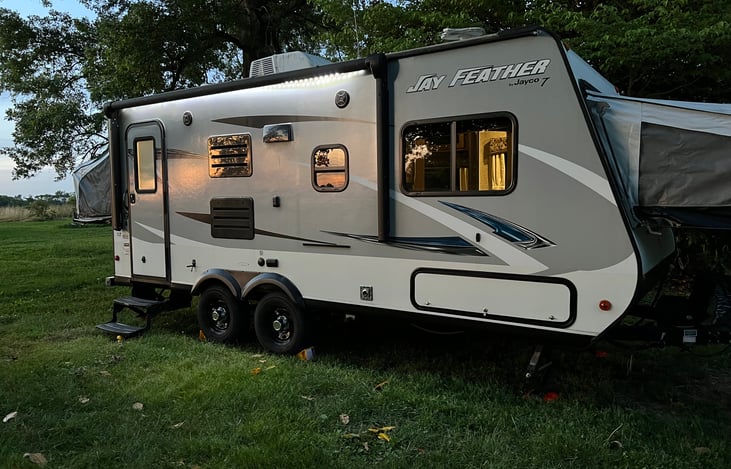 Jon & Lisa White have 3 children, a dog, cat and a handful of chickens. They love their home away from home. Casa Blanca is a 2017 Jayco Jay Feather X19H travel trailer. This hybrid trailer is perfect for a weekend get-a-way or a 3 week stay. Comes fully stocked with all linens, dishes, cookware and cooler for keeping your beverages cold while enjoying the campfire.