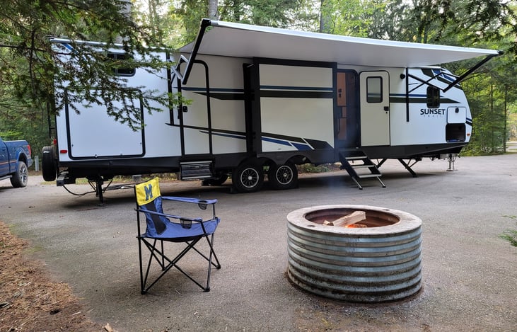 Like new travel trailer that will accommodate à large family. 1king, 3 doubles, and 2 twin beds. Full kitchen stocked w dishes and cookware. Electric fireplace. Outdoor kitchen w small grill and second small fridge. 1 bath w shower..and à second half bath. 1 tv and indoor outdoor audio. Bring own bedding and linen. Reese hitch. Can be pulled by f150 or équivalent.