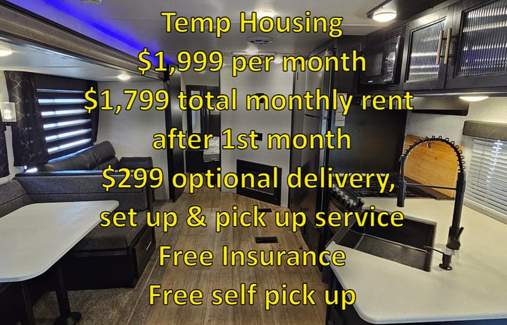 Temp Housing. $1,999 per month. $1,799 total monthly rent after the 1st month. $299 optional delivery, set up & pick up service. Free Insurance. Free self pick up.