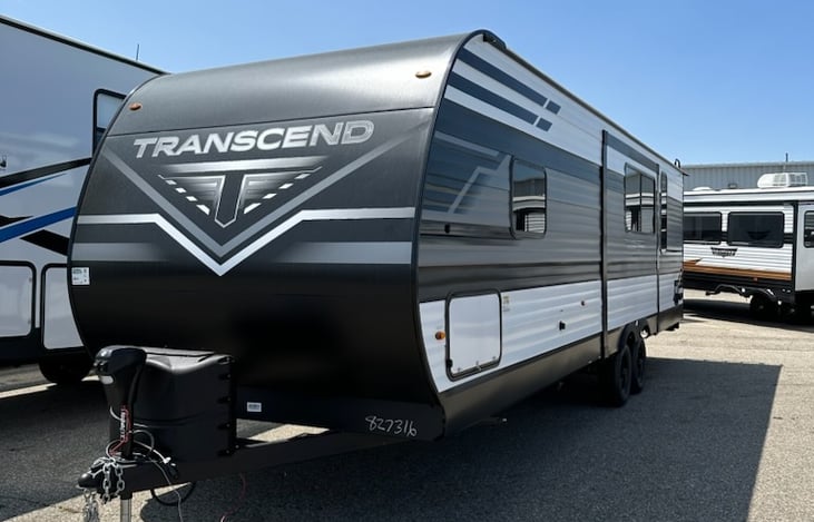 Our 2023 Grand Design Transcend Xplor is fit to sleep 6 to 8 people comfortably and with 1 large slide out there is ample space to move about or even enjoy TV/game time inside! It has a private room with a queen bed, a memory foam mattress for extra comfort, and plenty of storage. The rear bunkhouse has 2 full size beds in a bunk layout. The couch also folds into a full size bed.