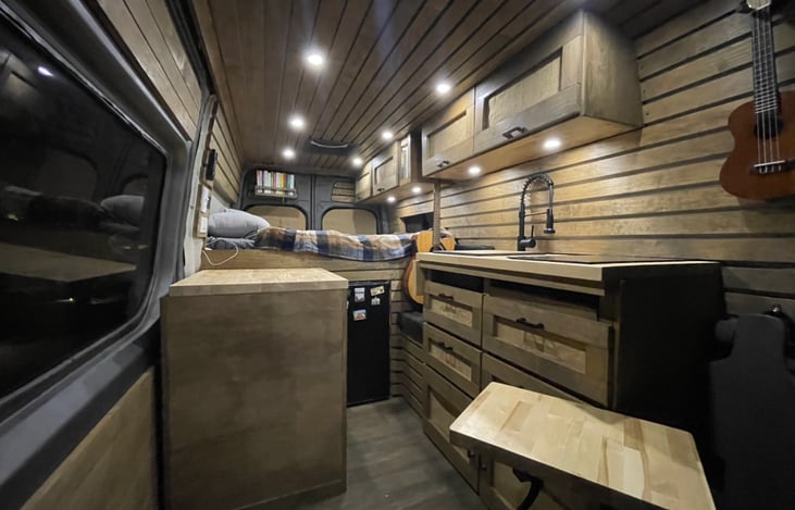 Sprinter is your cozy no-frills low-maintenance adventure rig! With a tempur-pedic convertible full bed and attachable lagun table, this van has comfort covered. The microwave, electric powered stove, 33 gallon fresh water tank, and solar panel powered 12 volt storage batteries make him perfect for boon-docking. Indoor cooling fan will keep you at a comfortable temperature.