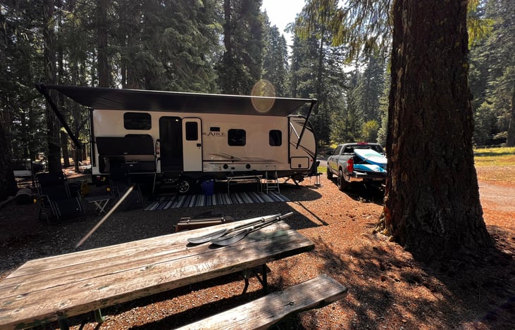 This Travel Trailer has been gently used with under 4000 miles and comes with 30amp converter adapter, dual 40lb propane tanks, dual lithium batteries, two outdoor rugs, two zero gravity chairs, water filtration system, Pots and pan along with kitchen wears and even an airfyer.
