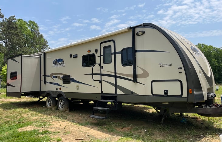 This RV is a spacious 36 foot tow behind travel trailer, but really feels more like home. Featuring a full sized bunk house with TWO dedicated slides, and a third slide in the kitchen, your family won't feel cramped and on top of each other.
