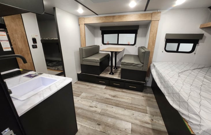 This travel trailer is small but mighty! She has a wonderful slide out that makes it even more spacious for the whole fam! It can comfortably sleep 5 or 6 with little kids.