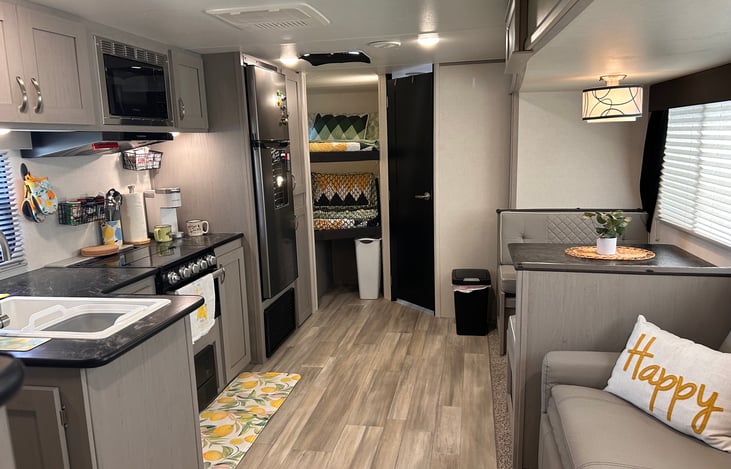 We had an amazing experience with this camper! There was so much room, even with two kiddos, who absolutely loved the bunk beds. Watching movies from the bunks was *the coolest* thing to them! The camper had everything we needed for a comfortable place to sleep at night, and the hosts were incredibly helpful throughout the whole process.