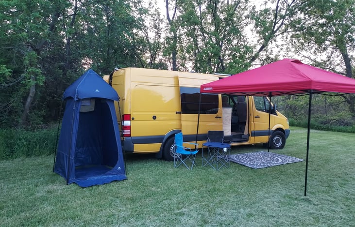 This Happy Camper is a 2013 Mercedez-Benz Sprinter 2500, custom conversion with full off-grid capabilities. It seats 4 and sleeps up to 5. The van is easy to drive and versatile for singles, couples, or small families/groups.