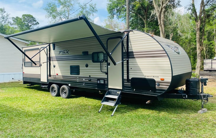 Has everything you need to enjoy your trip. Spacious Bathroom . 3 burner stove full size refrigerator and freezer microwave and 32 inch T.V. Power awning to enjoy the outdoors. Comes with a queen size bed along with a U shaped dinette that folds into a full-size bed..