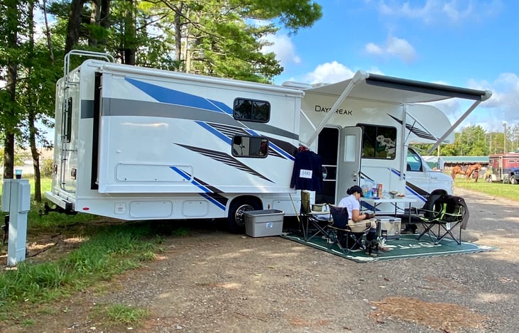 We had a wonderful vacation in this large, spacious and fully equipped RV. The Air Conditioning kept it cool during 2 very hot, muggy days. Having coffee in the morning while it poured rain was a great benefit as well.