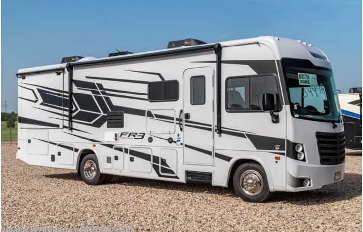 2024 Forest River FR3 32DS Class A motorhome. Sleeps 10 with a king size bed in the back, a 48" x 84" bunk above drivers cab, a 68" jackknife sleeper sofa, a 48" x 68" dinette, a 32" x 72" top bunk and a 42" x 72" bottom bunk/jackknife sleeper sofa. Automatic levers and double slide outs for lots of room. We have 3 TV's, 2 inside and 1 outdoor entertainment center, 12 cu. ft.