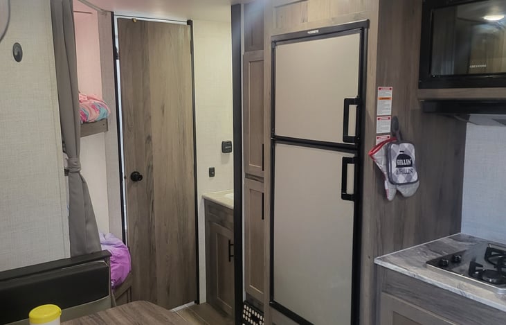 This is a spacious family camper with two full size bunks and a queen master bed. This camper is pet friendly. It's a tall camper with alot of headspace even in the shower, which also has a tub for young kids. Tv and DVD player as well as a chromcast is installed. We provide clean bed sheets and comforters as well as towels and wash clothes.