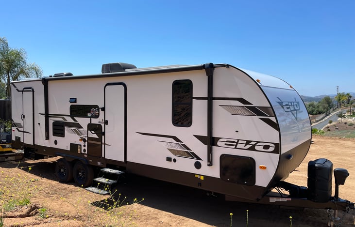 2023 EVO T2650 33’3” Travel Trailer with large bunks and private front master bedroom.