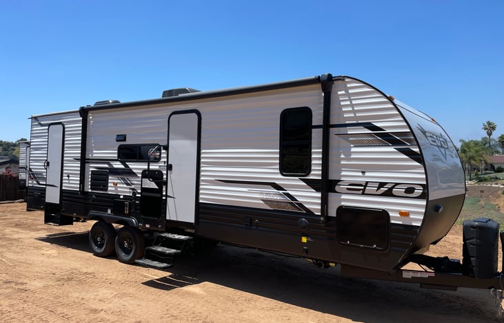 2023 EVO T2650 33’3” Travel Trailer with large bunks and private front master bedroom.