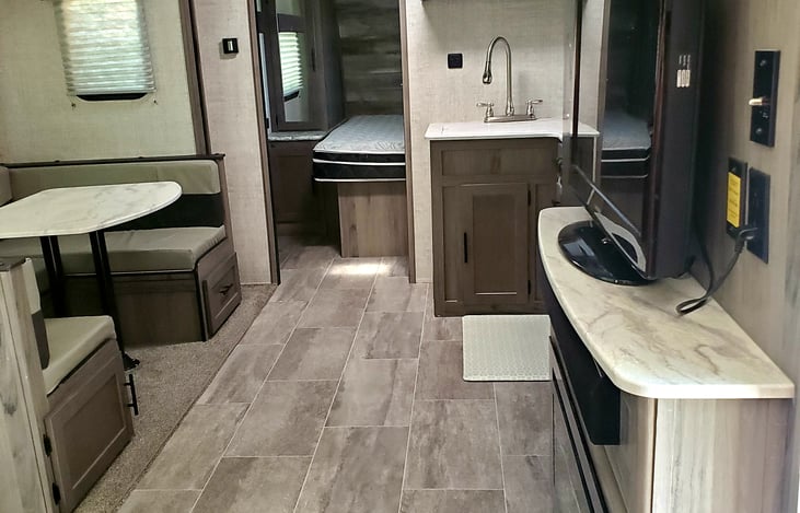 Slide Out opens up so much space. Plenty of room for a large family without feeling like you are stepping over each other. Updated AC keeps the camper nice and cool during those hot summer days. For those cooler evenings in the fall enjoy the warmth of the fireplace, Sit back, relax, and enjoy all this camper has to offer during your camping trip.